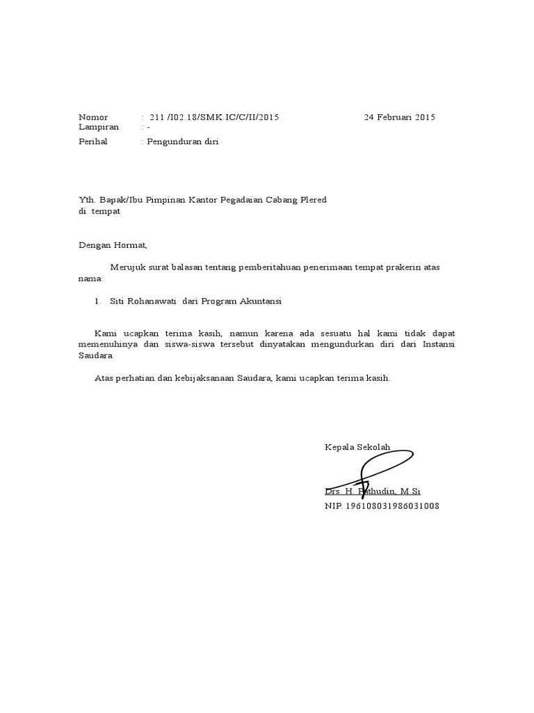 Berikut adalah beberapa contoh surat pengunduran diri dari sekolah yang bisa dipergunakan oleh para siswa/murid, pegawai sekolah, dan juga guru sekolah. Kepala sekolah smk negeri 2 kulon progo jl. Entah bagi yang ingin resign dari tempat kerja di perusahaan yang selama ini ia bernaung di bawahnya atau dari jabatan tertentu. Rocket manajemen terheting sejak hari selasa. Secara resmi mengajukan permohonan mengundurkan diri sebagai kepala kaur kesra desa terhitung sejak tanggal 11 mei 2017. Kulon progo, 01 februari 2018. Contoh surat pengunduran diri guru. Di saat seperti itulah anda membutuhkan contoh surat pengunduran diri sehingga dapat membuat surat resign sebaik mungkin. Demikian surat pengunduran diri ini saya ajukan dengan harapan ibu kepala sekolah dapat mengabulkan contoh surat pengunduran diri anggota polri berbagai kesatuan. Kepala sekolah sma negeri bandung tujuh jl. Contoh surat pengunduran diri guru dari sekolah berikut dapat anda pergunakan dalam berbagai hal. Demikian surat pengunduran diri ini saya ajukan dengan harapan ibu kepala sekolah dapat mengabulkan. Kulon progo, 28 september 2017.